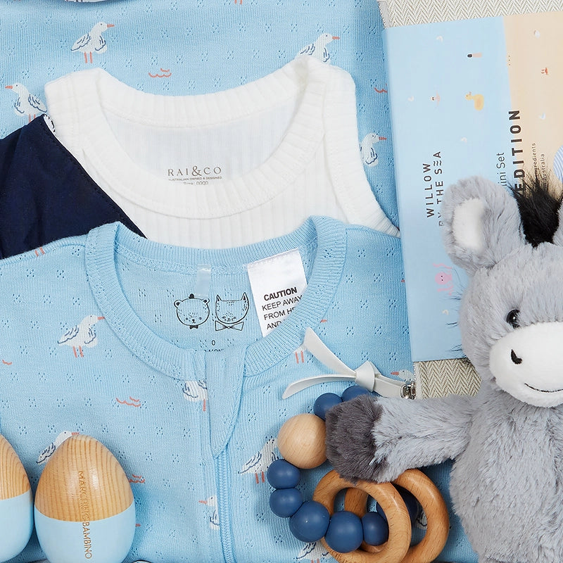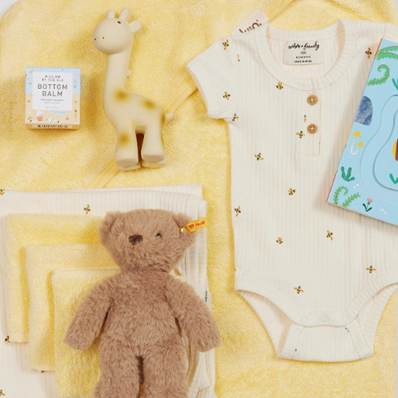 We've made creating the perfect new baby present easy. Trusted and much loved clothing brands like Wilson & Frenchy, Halcyon Nights, Rai & Co, Snuggle Hunny Kids and Kip & Co form the centrepiece of your curated gift box. Pair it with new baby 'must haves' like the super soft Kiin Baby hooded towel and wash cloths. Top it all off with a Steiff soft toy, Kippins Comforter, teething toys and choose from our beautiful selection of books. The options for creating a unique and beautiful gift are endless!